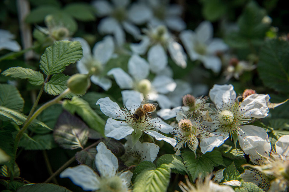 元柿畑だった養蜂場の近くに咲く野いちごの花から花蜜を集める蜜蜂