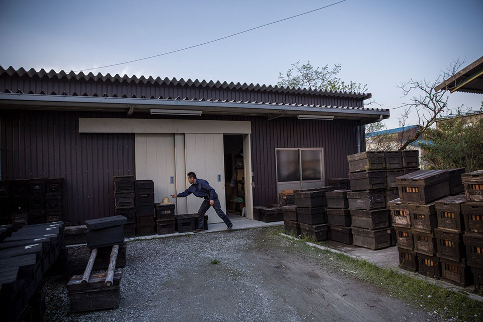 交配用蜜蜂の数を揃えなければならない期日は迫ってくる。光信さんは、東屋形集落の近くに、交配用蜜蜂を育てる蜂場として果樹園、お宮の上、門の下、元柿畑と呼ぶ4か所を設けている。それぞれが車で数分の距離だ。