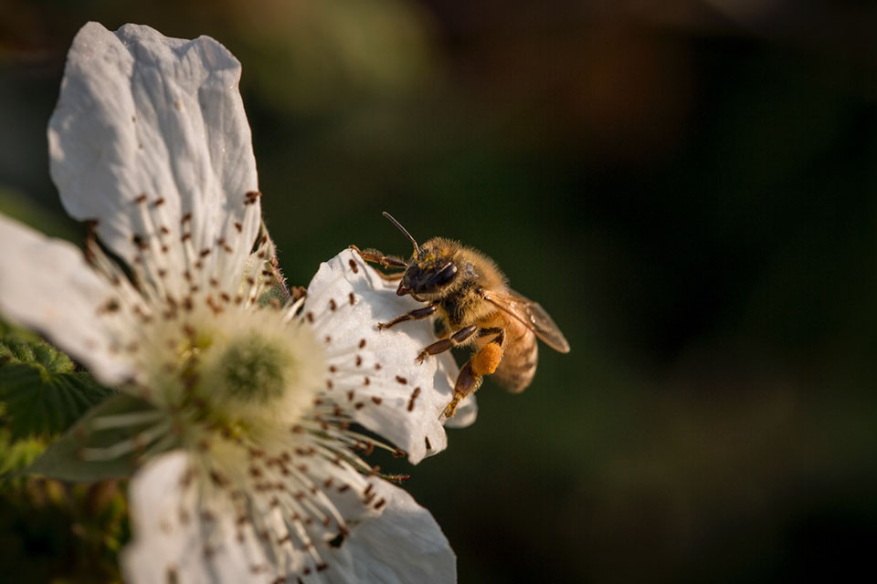 野いちごの花から花蜜を集める蜜蜂。脚に食料になる花粉団子を付けている