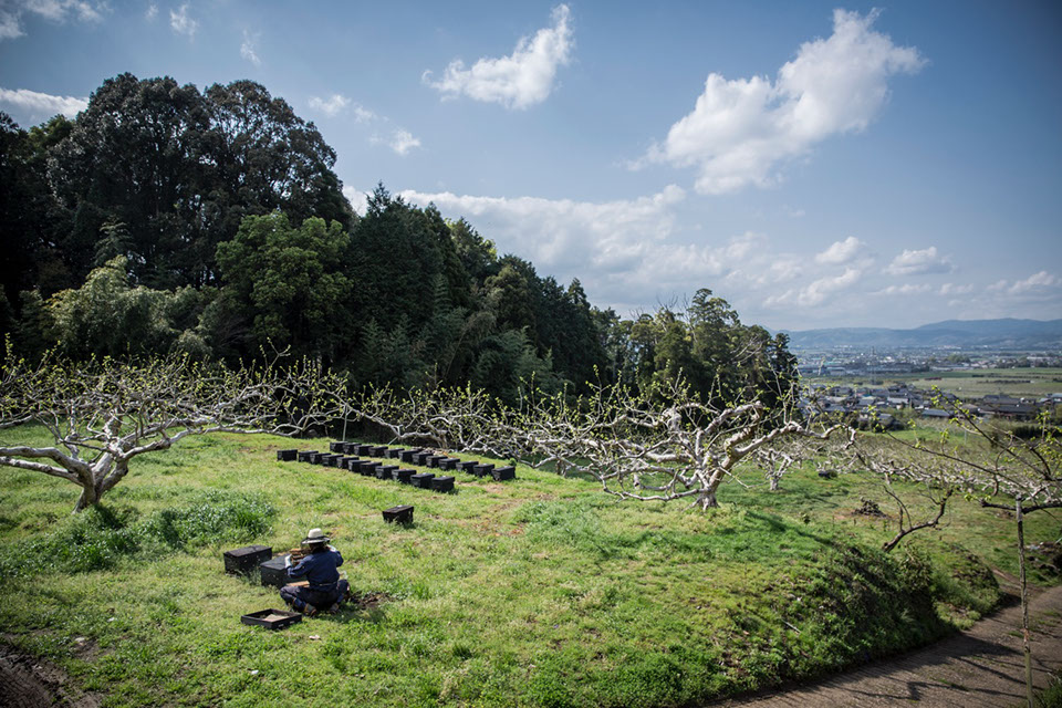 段々柿畑の中にある「果樹園」蜂場で、移虫した人工王台を点検する光信さん。右手奥にうきは市街地が広がる