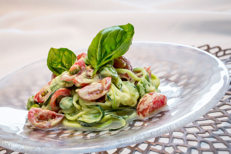 そんな話をしながらベジタブルスライサーのハンドルを回していると、受け皿はズッキーニの麺で一杯になった。後は、食べやすい長さにキッチン鋏で切って大きめのボールに入れ、先に作っておいたクリーミーアボカドソースで和えていくだけだ。しかし、一度にソースと麺を絡めようとすると均等にいかないので、ソースを少しずつ加えながら万遍なく麺に絡ませていかなければならない。ソースとズッキーニの麺が均等に絡んだところで、一口大に切ったサヤエンドウとプチトマトを加えて軽く和え、器に盛り付けた後でバジルを添えれば出来上がりだ。