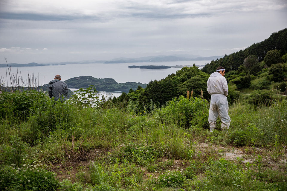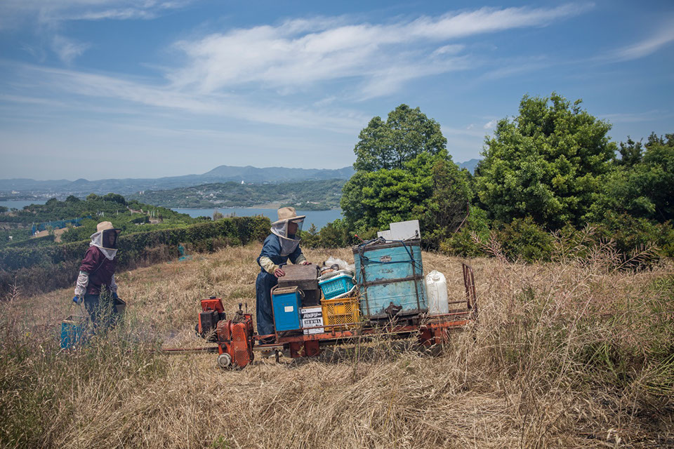 大村湾が広がる伊木力・元釜蜂場で採蜜作業を終えホッとひと息
