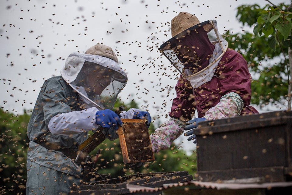巣枠を取り出す大宅さんと郷野さんの周りに蜂柱が立つ。大草2蜂場の蜜蜂はひときわ攻撃性が強いように思えた
