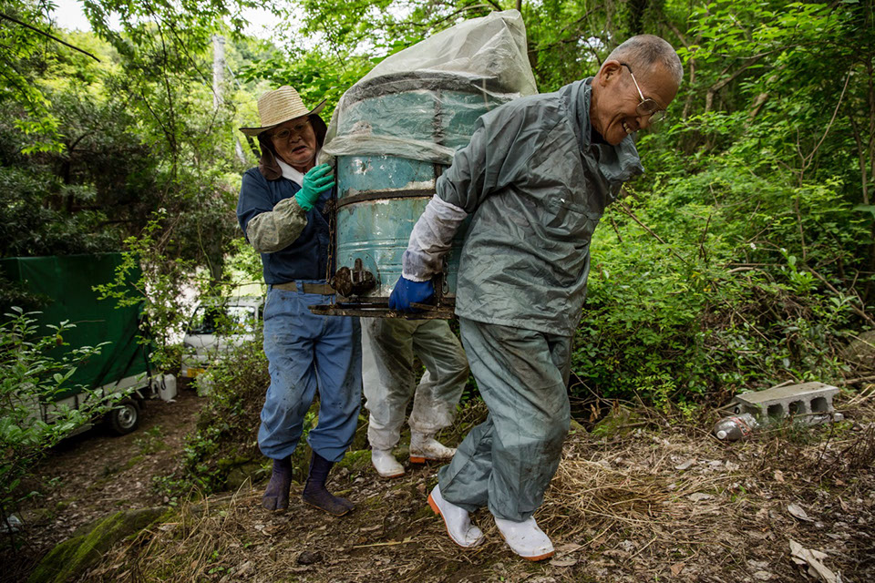 「元釜」蜂場は入口の農道から一段高い所にあるため、軽トラックでも入ることができない。遠心分離機をはじめ全ての採蜜の道具を運び上げなければならないのだ。巣枠を入れて運ぶ空の継ぎ箱、採った蜂蜜を入れておくポリタンク、燻煙器や包丁や漉し器などを運び上げ、最後に遠心分離機を3人で担ぎ上げて採蜜が始まった。大宅さんが巣枠の蜂を払い、前田さんが蜜房の巣枠を運び、川下さんが蜜蓋を切ると、前田さんが遠心分離機にセットする。やはり5人でやっている仕事を3人では忙しそうだったが、1時間ほどで井川さんと郷野さんが駆けつけた。