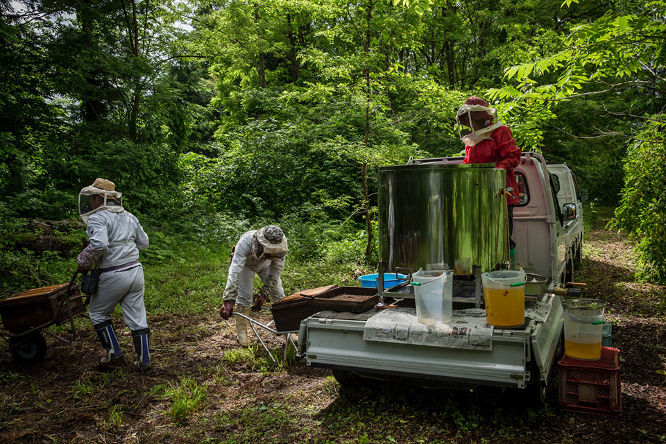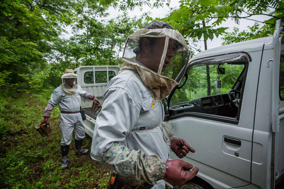 「天気予報だと、もう雨は上がる筈なんですけど……。今年は、まったく天気に恵まれない。良い天気の下で仕事をした記憶がないですね。去年、投資したんですよ。遠心分離機を買ったんです。食品を扱うものなんで、やっぱりステンレス製なんですよ。70万円です。高いんですよ。今年、唯一良かったのはトチですかね。トチ蜜が終わってアカシア蜜なんですよ。アカシア、アカシアとアカシア主力でいってるんですけど、今年も見事に転(こ)けました。アカシアの花の匂いがしたというのは、今年は1日だけですね。蜂だけだったら、今年は食えないですよ。うちは農業もありますから……。こうして待っている間にも、蜜は減っていってるんですよ。(蜜蜂が餌として)食っちゃってますから。この雨が上がったら行きますよ」