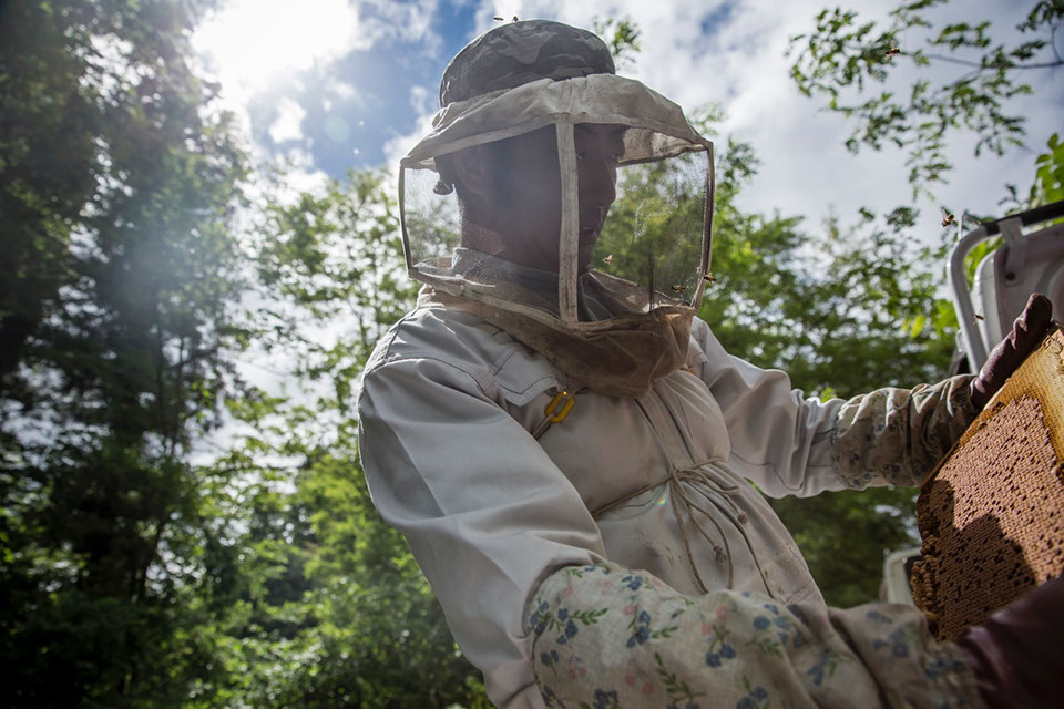 面布を被っていても羽音の中で休みなく作業をするのは緊張を強いられる。武和さんが作業の合間でふっと放心したような表情を見せた
