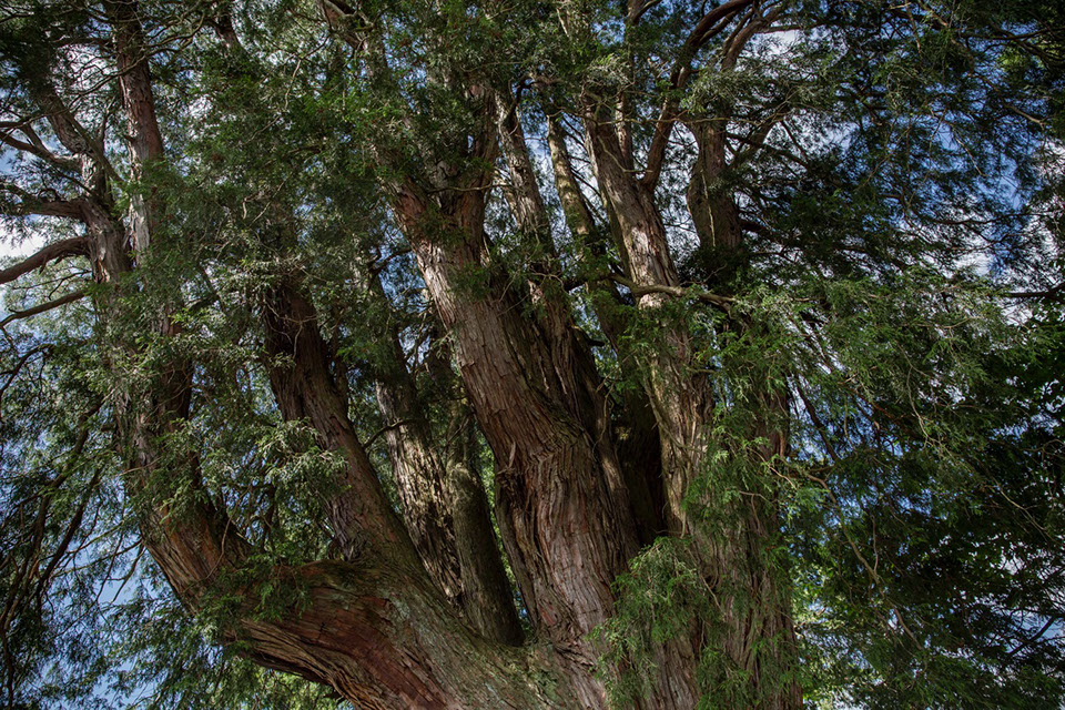 傳農家の自宅入り口に聳えるイトスギの巨木は、途中から何本もの枝に分かれて上へ伸びている