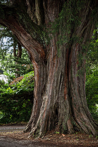 傳農家入口にそびえ立つイトスギ(糸杉)の巨木。