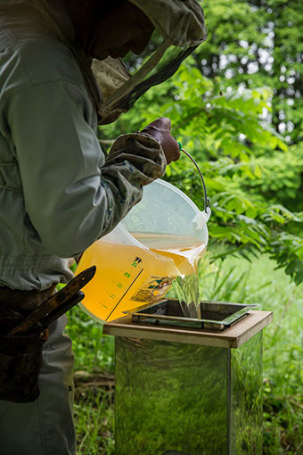 遠心分離機で採蜜したアカシア蜂蜜を漉し器に移す