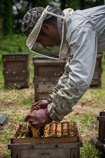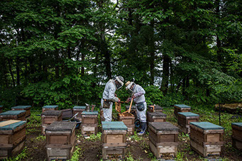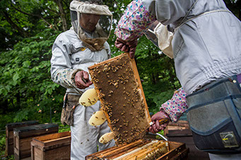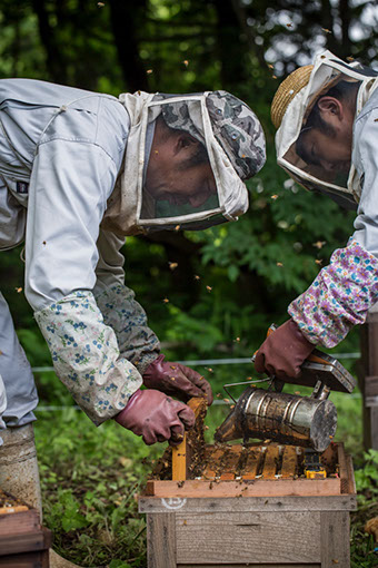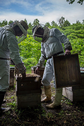 採蜜の後半も、武和さんと拓磨さんの呼吸はぴったり合っていた。武和さんが採蜜の終わった巣板を巣箱に戻すと、その上に拓磨さんが蜂の集ったドンゴロスをそっと被せる。続いて、拓磨さんが燻煙器の煙を吹き掛けて巣箱の周辺に居る蜜蜂を追い払うと、武和さんは人差し指で軽く巣箱の周りをなぞり、残っている蜜蜂を追い払ってから蓋を被せる。そのタイミングが兄弟ならではの阿吽の呼吸なのだ。