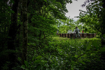 花園蜂場に到着すると、直ちに熊避け電柵の電源を切り、面布を被り燻煙器を準備して採蜜モードに突入する傳農武和さん(右)と拓磨さん