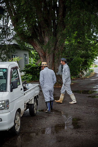 空には雨雲が広がっているが、もう待ちきれないという感じだ。武和さんが拓磨さんに声を掛ける。「まだだか、(雨は)落ぢでるか。もう一息か」「ん、だな。おらは、バンで行けば良いべ」と、拓磨さんが応える。「んだ」。小雨が残る中、兄弟が先に出発すると、母親の悦子(えつこ)さん(64)が軽自動車の箱バンで続く。