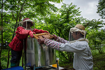 傳農武和さんは巣箱から取り出してきた蜂蜜の溜まった巣板を点検し、蜜蓋を切り、遠心分離機を担当する母親の悦子さんへ手渡す