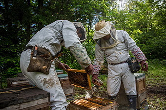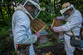花園蜂場で内検する傳農兄弟。巣板を取り出す武和さん(左)を