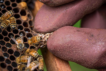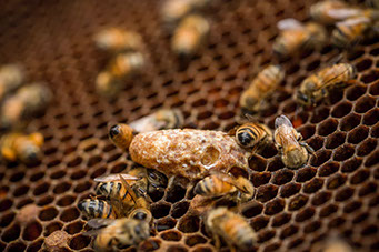 他にも、武和さん独自の考え方が反映していたのは、採蜜を終えて巣板を元の巣箱に戻す時だ。雄蜂の幼虫にダニが付いて増えていくため、多くの養蜂家は巣蓋を切って雄蜂の幼虫を巣房から出して巣箱に戻すのだが、武和さんは雄蜂の巣蓋を切らないのだ。