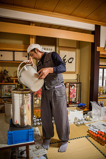 翌々日に武和さんを訪ねると、自宅の座敷に一人座り込んで蜂蜜のビン詰めと出荷準備をしていた。「ビンに入れる量や品質管理の面を考え、他人に任せず自分でやるようにしています」と言う。武和さんのこだわりが、ここにも反映しているのだ。ステンレス製のタンクからアカシア蜂蜜をビンに詰めている。ビンの口ギリギリでピタッと蜂蜜を止める。真剣な武和さんの目つきが集中力を物語る。ビン詰めを終えると、ビンの底を右膝の布でクルリと回すように拭いてOPPフィルムの袋に入れてテープで止める。そんな一連の仕草が、武和さんにとって手慣れた作業であることを窺わせた。大きなイベントがあって大量のビン詰めを準備しなければならない場合も、日程を逆算して予定を立てて全て一人でやるのだから「自分でやる」ことへのこだわりは相当強いのだ。それでも、袋詰めしている途中で時折、気分転換を図るように「フーッ」と深く息を吐いている。ひょっとしたら武和さんは、この様な室内仕事を苦手としているのかも知れない。
