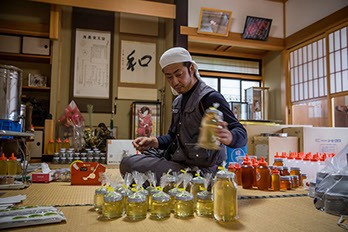 作業場と化した自宅座敷で蜂蜜のビン詰めを袋に入れる