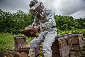 この日、武和さん兄弟が内検を終えた時は、午後6時近くになっていた。面布を被ってはいるが、目の前で羽音を立てて蜜蜂が飛び交う中で作業するのは気持ちの休まる暇がない。自然の中での仕事だからこそ天候に左右され、自然と共に生きる蜜蜂の生態リズムは待ったなしである。わずか半日ほどだったが武和さんの働きぶりを拝見して養蜂家の仕事の大変さを垣間見たように思えた。