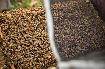 武和さんの面布越しに巣板に集る蜜蜂の状態を見る
