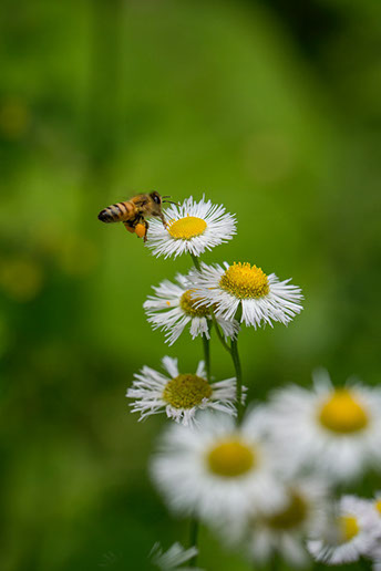 脚に花粉を付けた蜜蜂がヒメジョオンの花の花蜜を採ろうとしている
