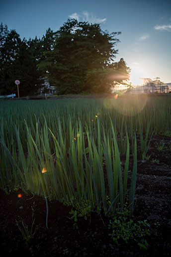 この日の作業を終えた午後6時半ごろ、沈む直前の夕陽が主力作物のネギを照らし出す