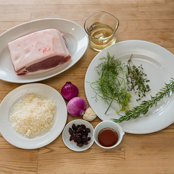 「今回は食材が多いです。ハーブがタイムとローズマリーそれにディル。ニンニク、タマネギ。今日はちょっとおしゃれに紫です。後はパン粉とレーズン、赤ワイン、いや、白ワインにします。それに蜂蜜と塩、コショウですね。豚の肩ロースは600グラムありますからね、結構な量ですよ」
