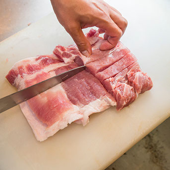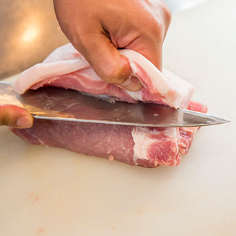 「順番としてはレーズンをワインに浸けて、柔らかくしておきます。続いて豚の肩ロース肉に包丁を入れて平たく広くしたいんですが、切り離してしまったら失敗。慎重にいきます」