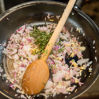 ④ ニンニク、タマネギ、ハーブを炒める