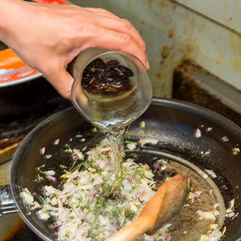 ⑤ 白ワインとレーズンを加える