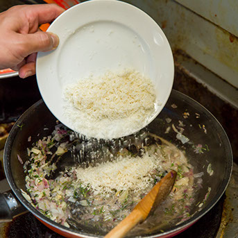 ⑥ 炒めた詰め物にパン粉を加える