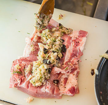 平たく広げた豚の肩ロース肉の上に出来たばかりの詰め物を置き、ロールケーキの要領で巻いていく。しかし、巻くたびに横から詰め物が飛び出してくる。