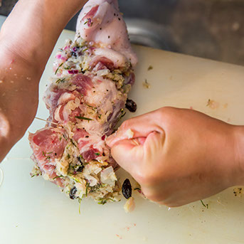 「これ豚の肩ロースのブロックなんです。ブロック肉を切り離さないように右と左から水平に交互に包丁を入れて、平たい1枚肉にします。その上に詰め物を置いてクルクル巻いて、オーブンで焼きます。料理の名前ですか。今から考えます」