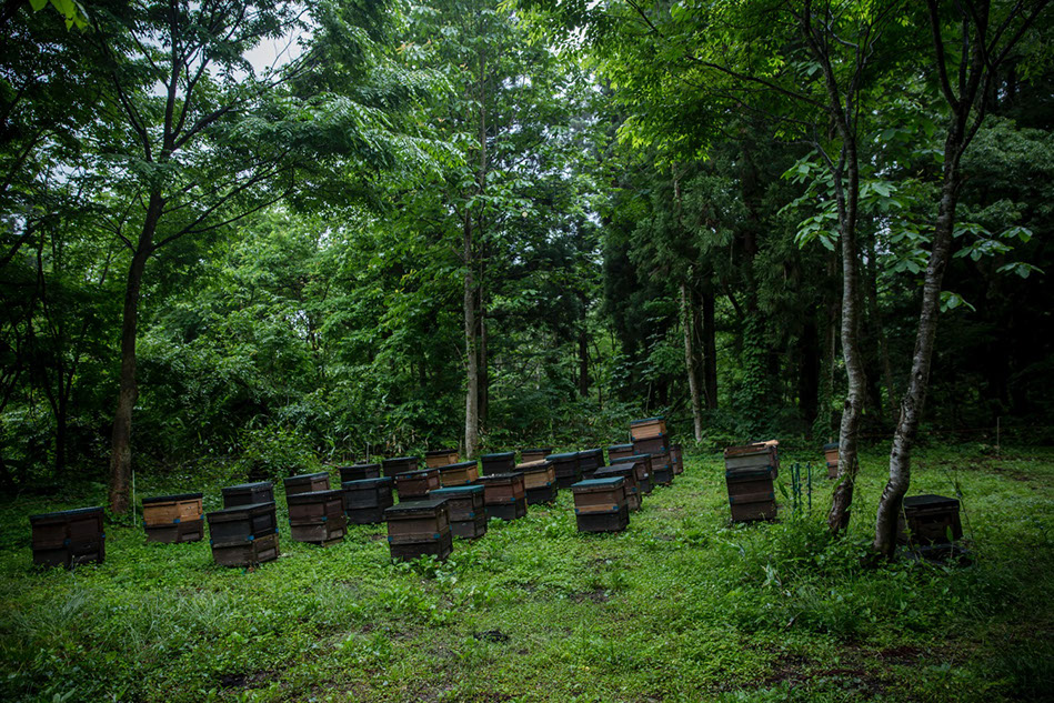 小雨が降っていた八乙女山蜂場に置かれた巣箱の佇まい。巣箱の置き方で養蜂家の仕事ぶりが伝わってくる