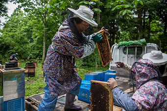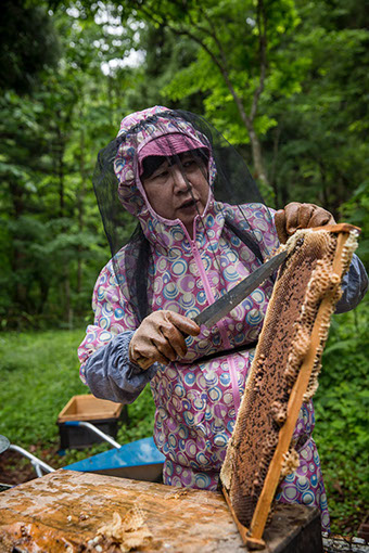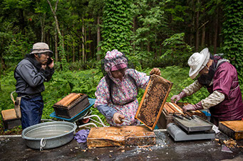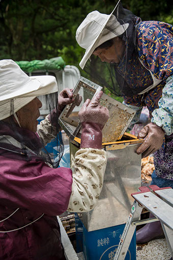 継ぎ箱から蜂蜜の溜まっている巣板を取りだし、蜜蜂を払って運ぶのは、芳行さんの仕事だ。画面後方は、蜜蓋を切る両親や妻の直美さん
