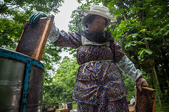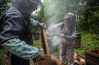 「初めて採蜜に一緒に行ったのは、リンゴ蜜の採蜜の時で、リンゴの花が満開で、それが綺麗で見渡す限りリンゴの花。蜂のことより、それが綺麗で感激していましたね。越冬する時も一緒に行って、冬囲いして屋根掛けも手伝いますけど、そんなに苦じゃないです。刺されるのは嫌ですけどね」