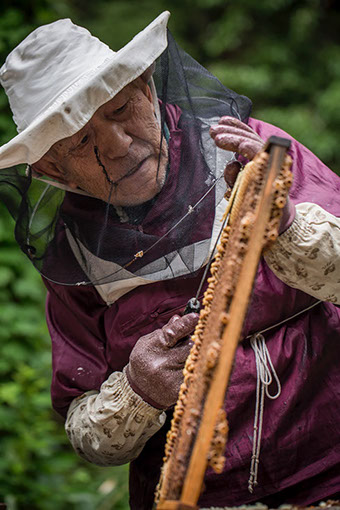 巣板の蜂を払う芳行さんの仕事ぶりを、父親の鈴木三郎さんが