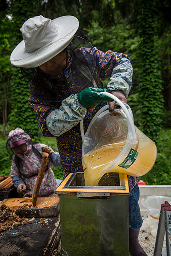 遠心分離機でしぼった蜂蜜を恭子さんが漉し器に移す