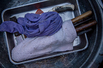 巣枠を取り出す芳行さんが、燻煙器の煙で蜂を鎮める。雨などで外に花蜜を採りに行けない場合は蜂が荒れることがある