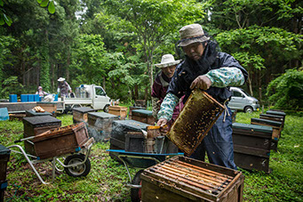 「その時に、冬の間だけ働きに来る人が居て、その人が地元の蜂屋さんだったんですよ。現場へ移動する車の中で話を聞いたら『半年で1年分稼ぐよ』って言うから養蜂に関心を持ったですね。夏になって近くの蜂場に採蜜の手伝いに行ったり、越冬の準備で福島県の浪江町まで巣箱を運ぶのを手伝いに行ったんです。片道7時間ですよ。養蜂のこと、7時間聞きまくるんですよ。翌年の春に『2群譲ってけろ』って、譲ってもらった。3年ぐらいは建設会社に行きながら蜂の世話をしていたけど、蜂が60群ほどになった時に独立して、その年は流蜜も良くて、こりゃいけるんじゃねえかと思いましたね。お師匠さんには何年も手伝いに行きましたよ。学校の先生みたいに、きちんと教えてくれる人でした」