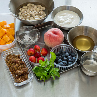 「グラノーラも通常だと小麦が入っているのですが、ローフードは小麦を使用しないので、蕎麦の実(アレルギーのある方はオートミール)やヒマワリの種、カボチャの種などを使ったローフードのグラノーラを使います。通常だとグラノーラってオーブンで2、3時間焼くんですね。ローフードのグラノーラは、焼かずにドライフードエアという乾燥器を使います。酵素は、温度が48℃以上になると死滅してしまうので、48℃以下で13時間くらい乾燥させた酵素の摂れるグラノーラなんです。これをパフェの中に一緒に入れて、甘いスイーツなんですけど、ちゃんと酵素が摂れて、体にも良くて栄養価も高いというパフェなんです。フルーツは今、桃が美味しい季節なので桃をベースに色んなフルーツを入れますね」