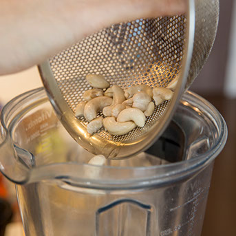 「アイスクリームが出来るまでの間にホイップクリームを作ります。基本は、ここでも3時間浸水させていたカシューナッツ200グラムなんです。ローフードでは色んなナッツを使うんですけども、カシューナッツが一番使われますね。蜂蜜は50グラム、お塩を2つまみと水50ccをバイタミックスに入れて、また、ちょっと回します。材料はほんとシンプルなんです」