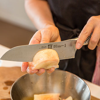 「最初はアイスクリームから作っていくんですけども、レモンとヨーグルトとナッツを使ったレモンアイスクリームというさっぱりした夏向きのアイスクリームです。それでは、レモンを搾りますよ」