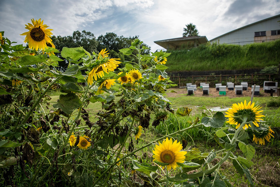 常滑市の大曽公園にある「ミツバチ牧場」に満開のヒマワリが咲いていた。毎年初夏に開催される「はちみつ搾り体験」では