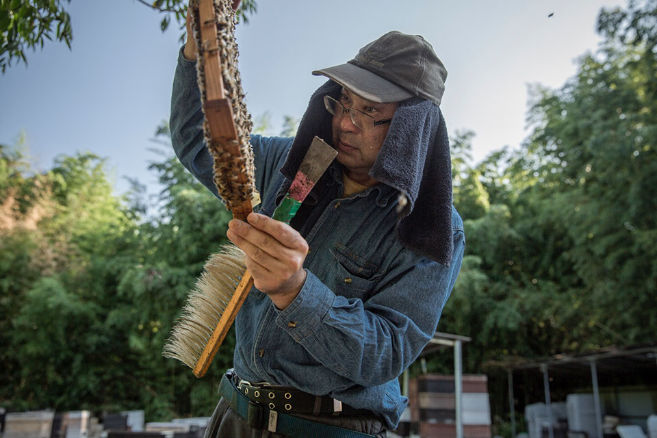 「蜂蜜は蜜蜂の主食、花粉は離乳食。花粉があれば産卵は進みます。祖父が元気な頃、巣箱の蓋を開けずに巣門の蜂の様子を見ただけで、今日は機嫌が良いとか悪いとか言うんですよね。当時は、何を言っているのか意味が分からなかったですね。内検は地味でお金にならない仕事なんで、やりたがらないんですけどね。でも、一番大事な仕事で、そこを手を抜くと、翌年以降に絶対悪影響が出ますね。蜂っていうのは、手を入れれば入れるほど良くなります。マメな人の蜂っていうのは良いですね」