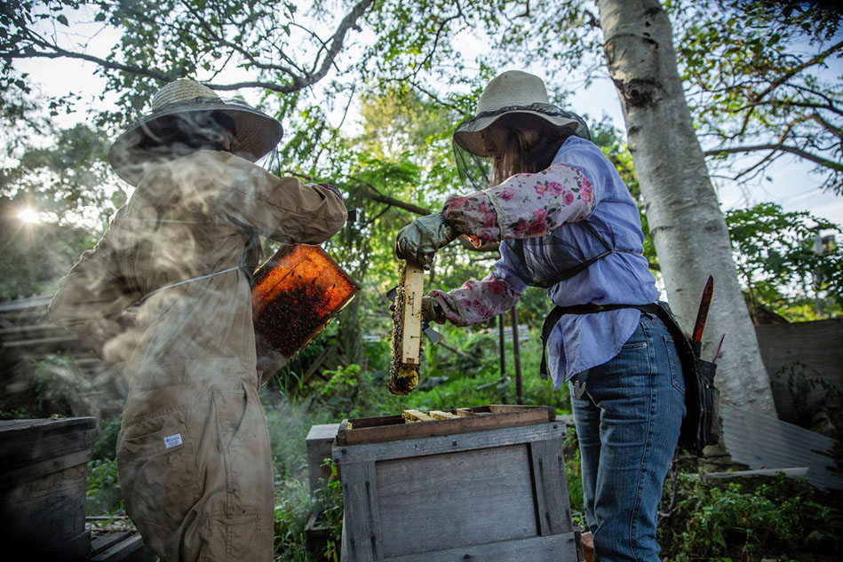 里美さんはアッシュベージュのロングヘアで、鼻にはリングピアス。およそ一般的な養蜂家のイメージとは異なるが、働く姿はキビキビと心地良い動きをしている。
