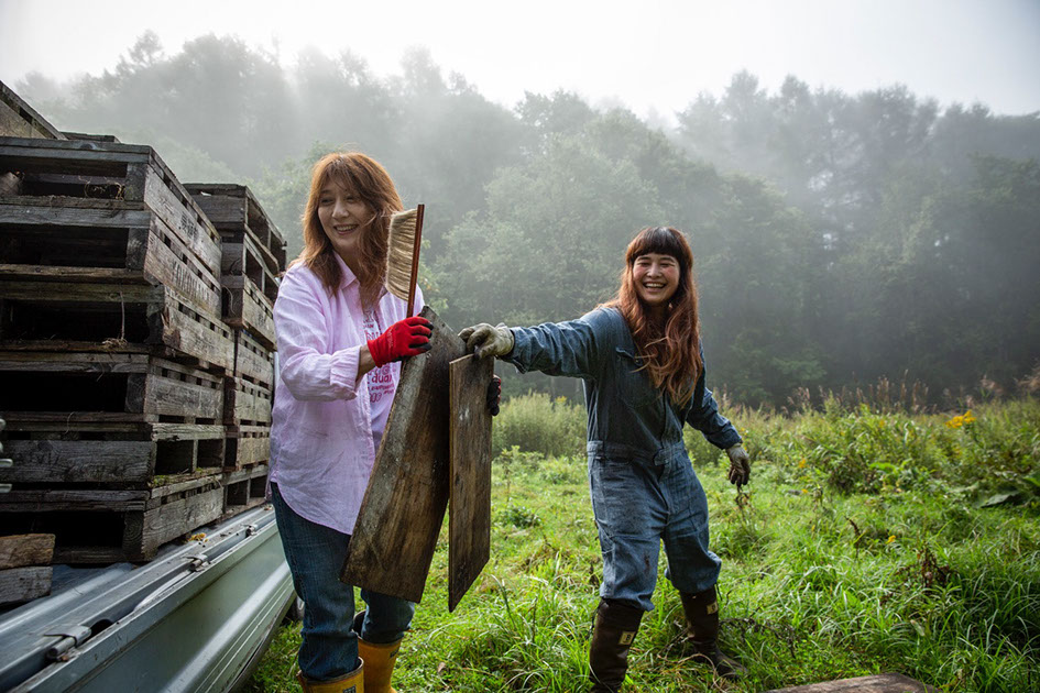 土場前の蜂場を片付ける里美さん。パレットの下にいたル大きなミミズを可愛いと手にのせていた
