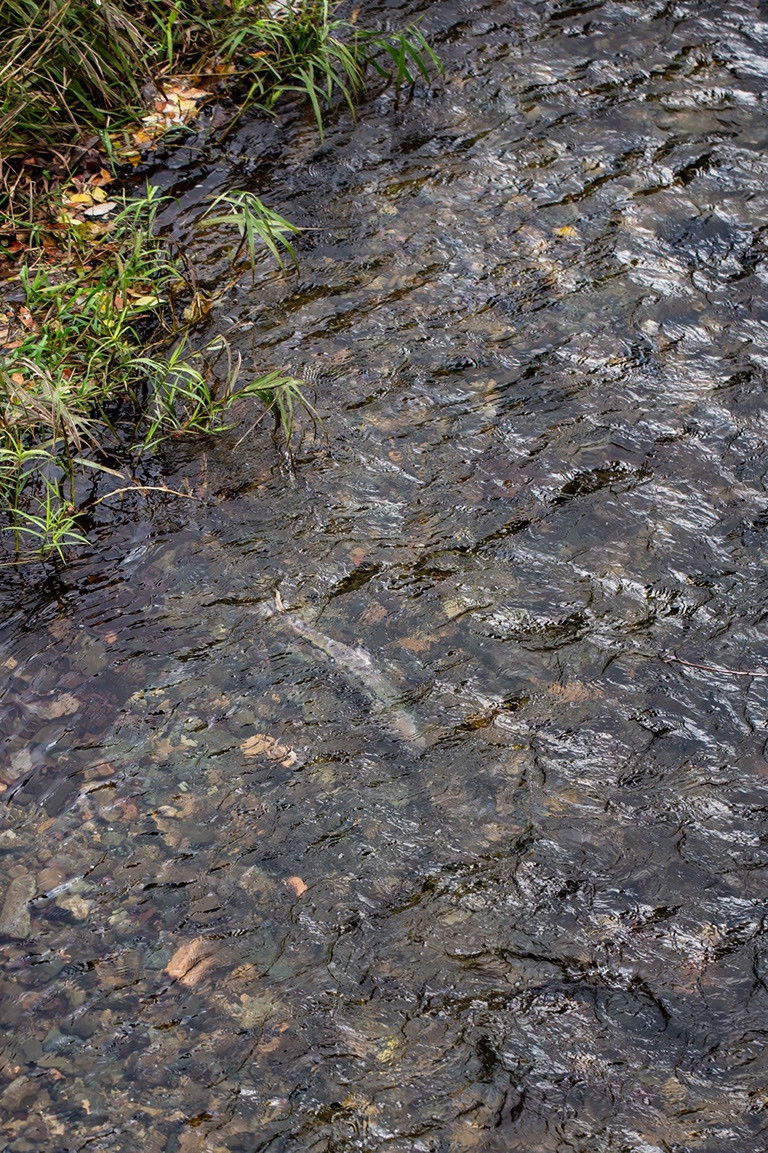 乙部川中央付近に産卵のために遡上したサケが辛うじて見える