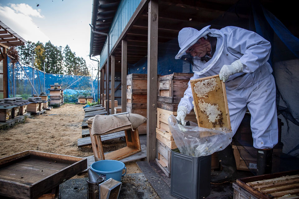 「私の出番は搾る時だけですから。お父さんが頑張っているし、こだわりの人だから。自分のやり方があるんで、私が手を出すと嫌がるんですよ。他の人が巣箱の近くに来るのも嫌がるんです。色々な病気は外から持って来ますからね」