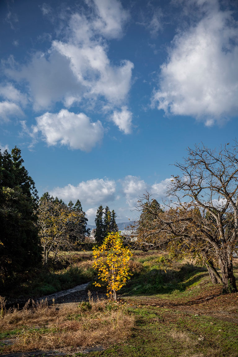 乙部川の畔に君塚さんが植えたユリノキが黄色く色付いている