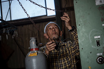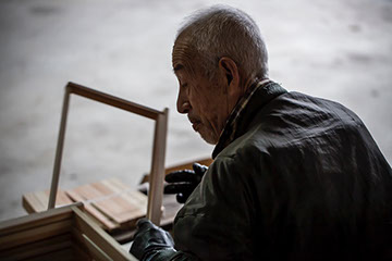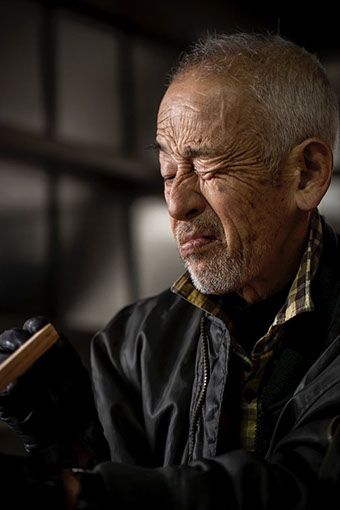 店舗兼自宅の横には、まだ新しく大きな鉄骨構造の倉庫が建っていた。ゆっくりと孝伸さんの一代記を聞かせてもらった後、彼は、この倉庫で巣枠作りを始めた。倉庫の中はひんやりして石油ストーブが燃えている。倉庫ではすでに、隣で農家を営む重松秀美(しげまつ ひでみ)さん(62)が黙々と巣枠作りをしていた。秀美さんは、米、麦、大豆を生産する農家だ。同じ重松姓でも親戚関係ではない。